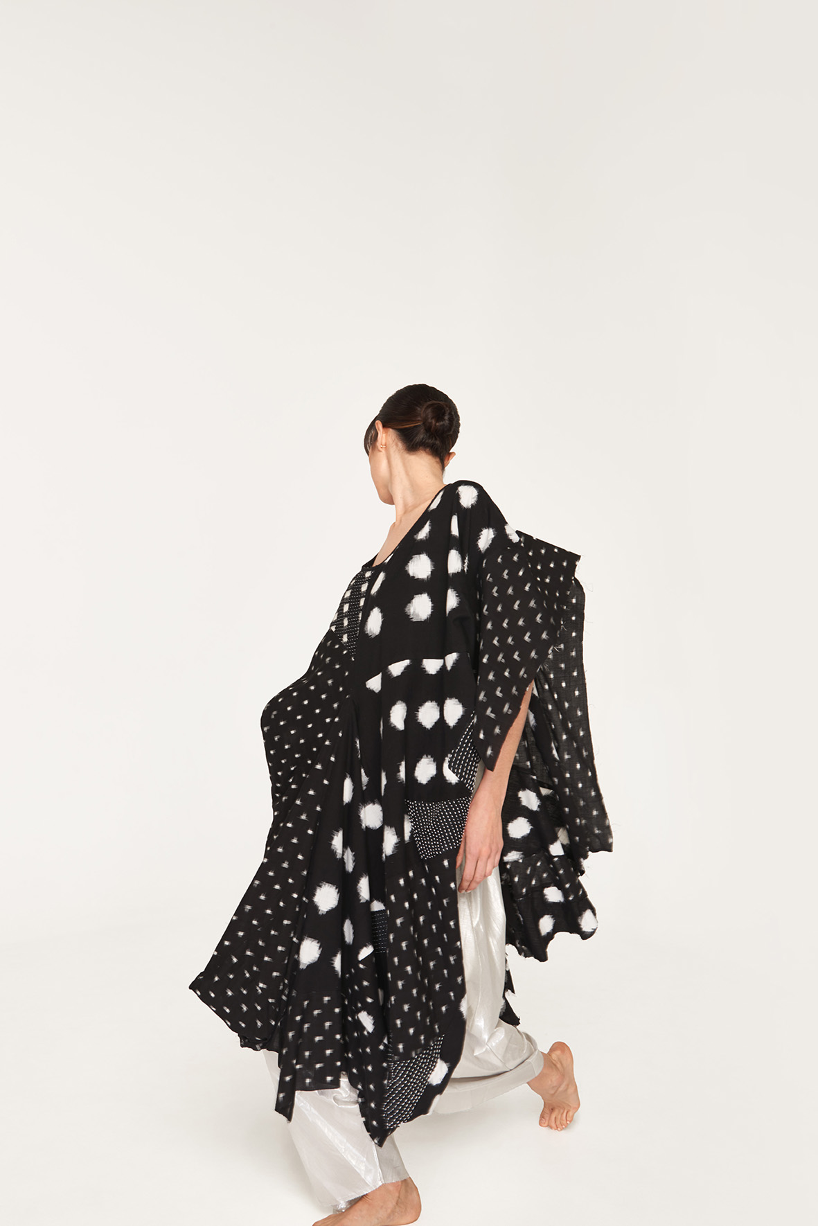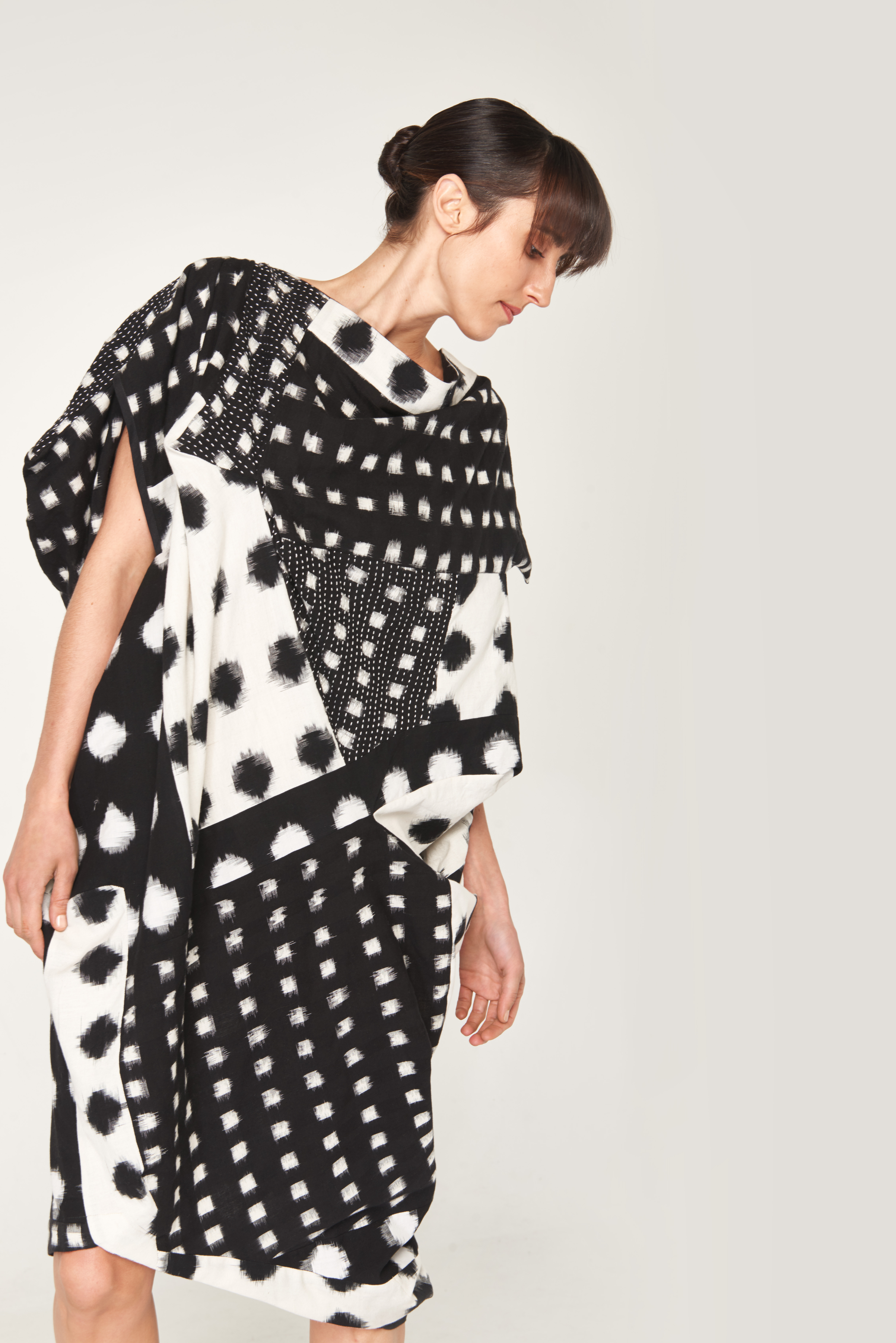 These garments are made using my method of Dynamic Cutting. Ikat cloth was first sourced in India, and I cut and constructed these experimental garments using the material affordances of combining fabrics. Included are hand-stitched cloth fragments.